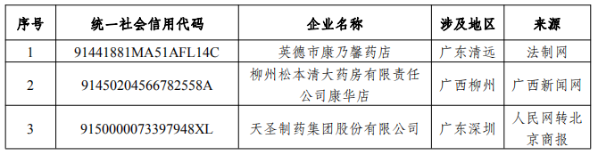 近期媒體披露制售假藥典型案例主要涉及8家企業(yè)和2家個(gè)體工商戶,其余24個(gè)案例主體均為自然人。具體來(lái)看,近期媒體報(bào)道涉制售假藥的企業(yè)和個(gè)體工商戶失信主體分布在江蘇海安、廣東深圳、廣東清遠(yuǎn)、廣西柳州、四川成都等地區(qū),其中主體名稱、統(tǒng)一社會(huì)信用代碼明確的共有3家(見表1)。