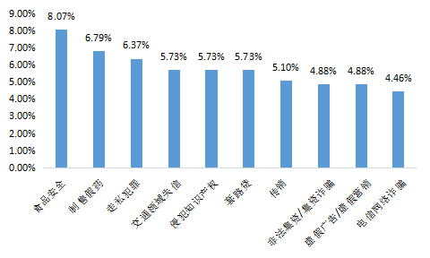 從失信行為類型看,7月份失信案例主要涉及食品安全(8.07%)、制售假藥(6.79%)、走私犯罪(6.37%)、交通領(lǐng)域失信(5.73%)、侵犯知識(shí)產(chǎn)權(quán)(5.73%)、套路貸(5.73%)、傳銷(5.10%)、非法集資/集資詐騙(4.88%)、虛假?gòu)V告/虛假營(yíng)銷(4.88%)、電信網(wǎng)絡(luò)詐騙(4.46%)(見圖2)。