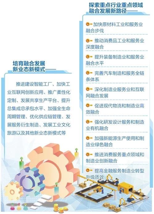 例如:在推動消費品工業(yè)和服務(wù)業(yè)深度融合方面,注重差異化、品質(zhì)化、綠色化消費需求,推動消費品工業(yè)服務(wù)化升級;在提升裝備制造業(yè)和服務(wù)業(yè)融合水平方面,推動裝備制造企業(yè)向系統(tǒng)集成和整體解決方案提供商轉(zhuǎn)型;在完善汽車制造和服務(wù)全鏈條體系方面,加快汽車由傳統(tǒng)出行工具向智能移動空間升級……